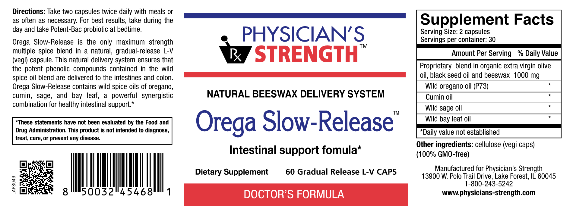 Orega Slow-Release is the only maximum strength multi-spice blend in a natural, gradual-release L-V (vegi) capsule. This natural delivery system ensures that the potent phenolic compounds contained in the wild spice oil blend are delivered to the intestines and colon. Orega Slow-Release contains wild spice oils of Oregano, Cumin, Sage and Bay Leaf – a powerful and synergistic combination for healthy intestinal support.